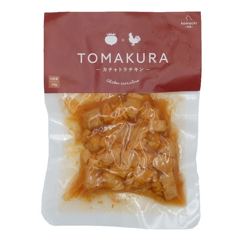 愛犬の健康と美味しさをサポートする、【komachi-na-】TOMAKURA カチャトラチキン 60gをぜひお試しください!秋田県産の鶏むね肉を使用し、風味豊かなトマトソース「TOMAKURA」に漬け込むことで、柔らかく仕上げました。