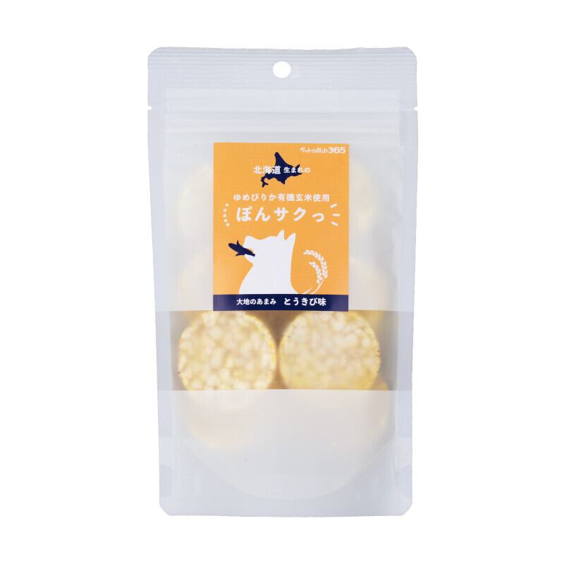 愛犬・愛猫にぴったりなごちそう、お楽しみください!【ペットの恵み365】有機玄米使用ぽんサクっ とうきび味は、北海度産の有機玄米を使用しており、ゆめぴりかととうきびだけで作られた健康的なスナックです。