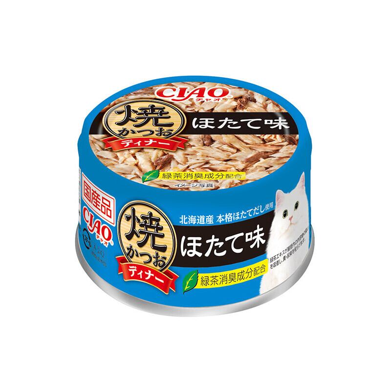 【CIAO】焼かつおディナー ほたて味は、愛猫のために特別に作られた贅沢なごはんです!新鮮なかつおを使用し、ほたての旨みを引き出した85gの便利なカップ入りで、毎日の食事にぴったりのサイズに仕上げました。