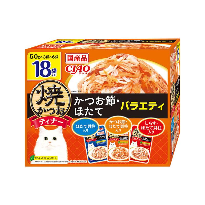 【CIAO】焼かつおディナー かつお節・ほたてバラエティ 50g×18pは、愛猫のために特別に作られた贅沢なごはんです!新鮮なかつおとほたてを使用し、風味豊かなかつお節を加えた50gの便利なパック入りで、毎日の食事にぴったりのサイズに仕上げました。