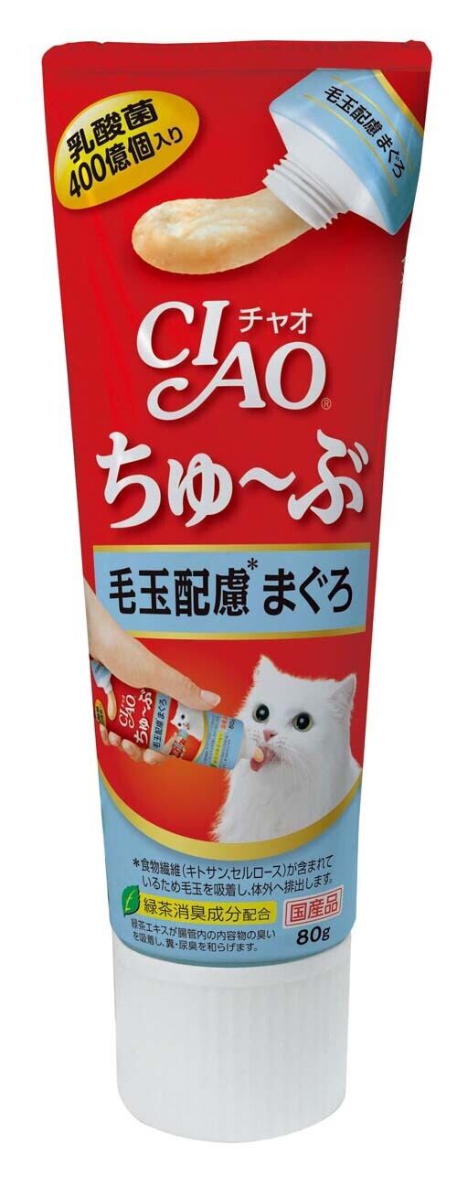【CIAO】ちゅ~ぶ 毛玉配慮 まぐろ 80gは、愛猫の健康を第一に考えた、特別なおやつです!新鮮なまぐろを使用したリッチな風味のチューブタイプで、毛玉ケアをサポートしながら毎日の食事に楽しさをプラスします。愛猫との特別なひとときを、この美味しさで豊かにしてみませんか?