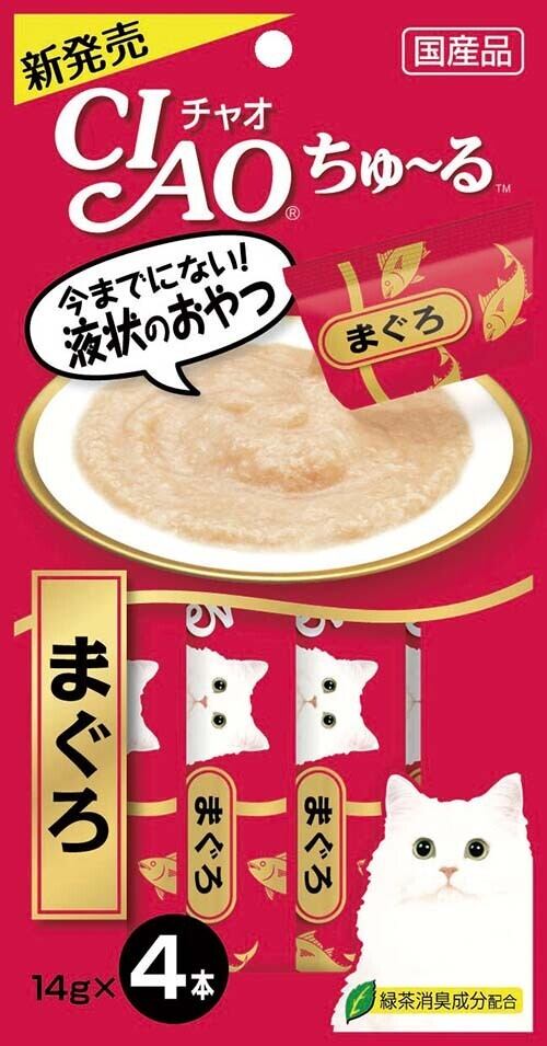 【CIAO】ちゅ~る まぐろ味 14g×4本は、愛猫に贅沢な美味しさを届けるために開発された特別なおやつです!新鮮なまぐろを使用し、愛猫の食欲をそそる風味を実現しました。この魅力的な味わいで、愛猫との楽しいひとときをぜひお楽しみください!