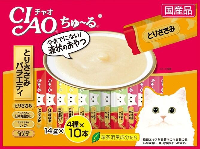 「ちゅ~る トリササミバラエティ」は、なめらかな液状と共に、ジューシーなとりささみの風味が特徴です!愛猫が喜ぶ新鮮な材料を贅沢に使用し、嗜好性を高めましたので、おやつとしてだけでなく、食事のトッピングとしても最適です。14g×4本入りで、いつでも新鮮な美味しさを簡単に楽しむことができます。