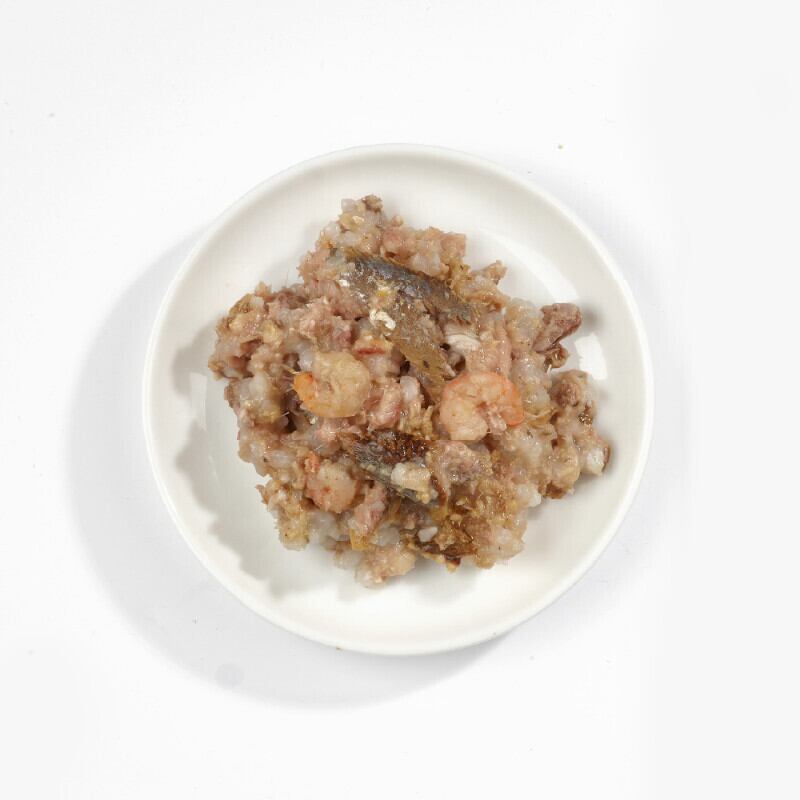 イワシベースに小エビと栄養抜群のフィッシュスープを含めた贅沢なウェットフード