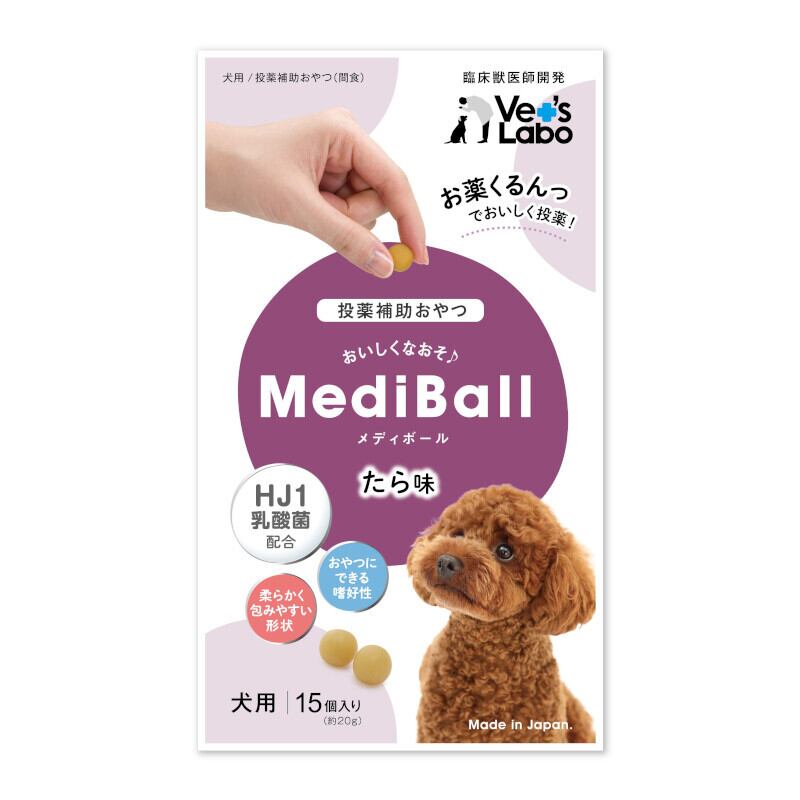 メディボールはお薬が苦手なワンちゃんのために臨床獣医師が開発した投薬補助用のおやつです。たら風味で大変美味しく食べられます。とてもやわらかい質感で、簡単にお薬を包み込むことができるので安心して与えていただけます。