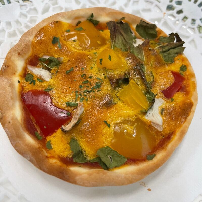 薄めの生地にパプリカ、乾燥きくいもなどの体に優しいお野菜をトッピング。