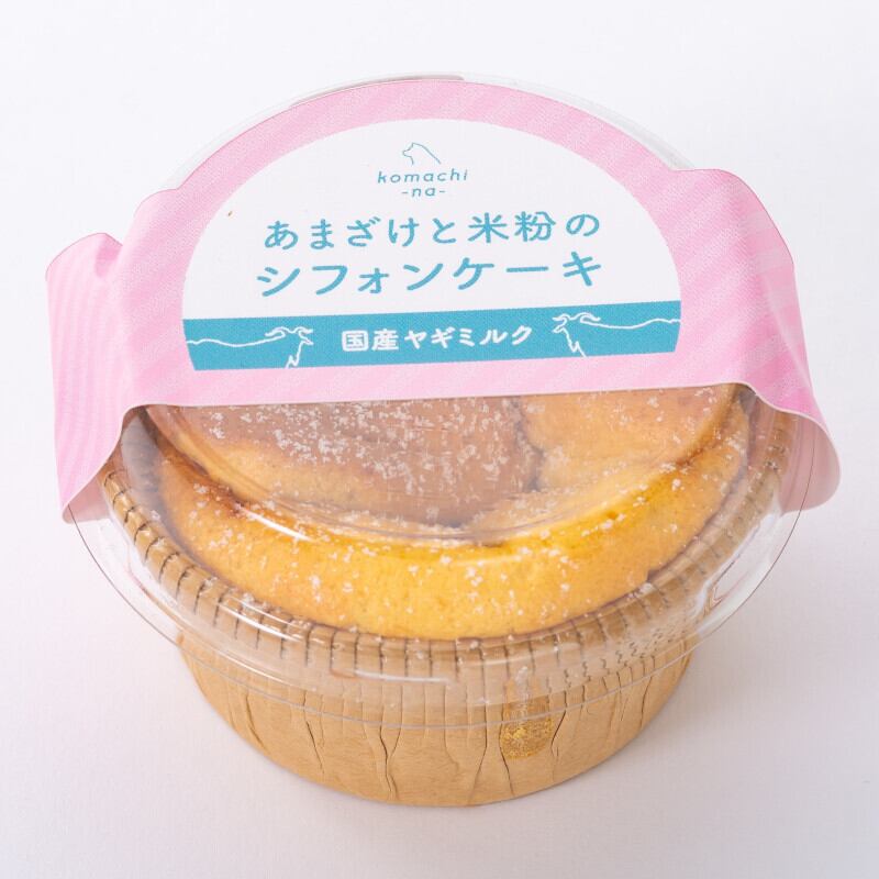 甘酒と米粉のマリアージュをお楽しみください!【komachi-na-】あまざけと米粉のシフォンケーキ ヤギミルクは、甘酒の自然な甘さとモチモチとした米粉の食感が魅力の無添加シフォンケーキです。