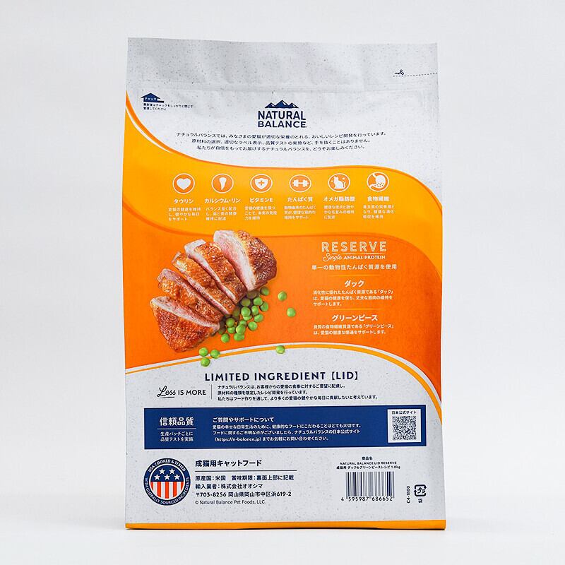 1.8kgの大容量パッケージには、ダックとグリーンピースの美味しさがぎっしり詰まっています。毎日のメインフードとしてだけでなく、トッピングやおやつとしても活用できるアイテムです。愛猫の日常の食事をより楽しく、栄養豊かにしてくれることでしょう。