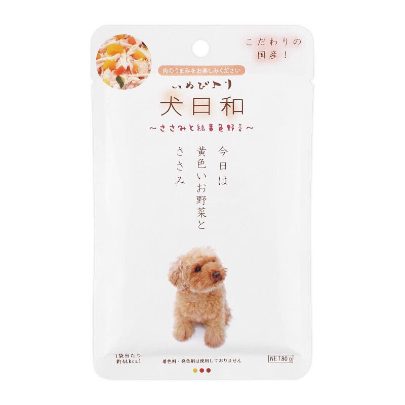 愛犬のために特別に設計された「【わんわん】犬日和 ささみと緑黄色野菜 80g」。新鮮なささみと季節の緑黄色野菜を使用した無添加のフードです。