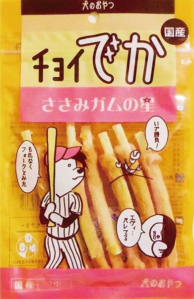 【原材料】〈肉部〉鶏ささみ、コーンスターチ、食塩、豚コラーゲン、増粘安定剤(加工でん粉)、グリセリン、ソルビトール、トレハロース、プロピレングリコール、リン酸塩(Na)、酸化防止剤(ピロ亜硫酸Na)〈棒部〉牛皮、米粉、増粘安定剤(グァガム)、酸化防止剤(ビタミンE)【成分】粗タンパク質40.0%以上、粗脂肪1.5%以上、粗繊維0.8%以下、粗灰分3.5%以下、水分20.0%以下【エネルギー】約313kcal/100g当たり