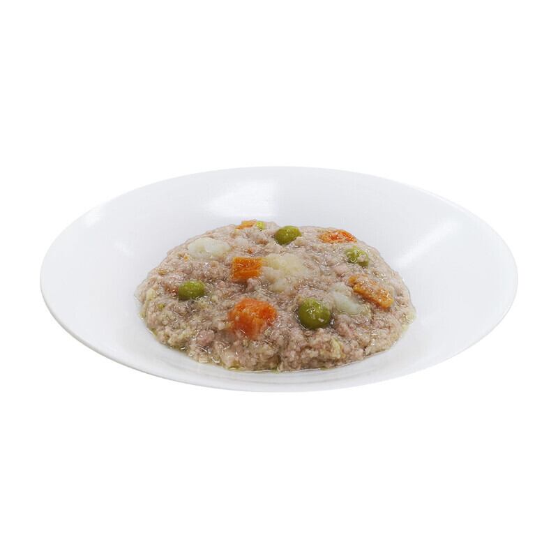 鶏肉に食物繊維を含む野菜(じゃがいも、人参、グリンピース)を加え、食べやすいミンチ状に仕上げました。