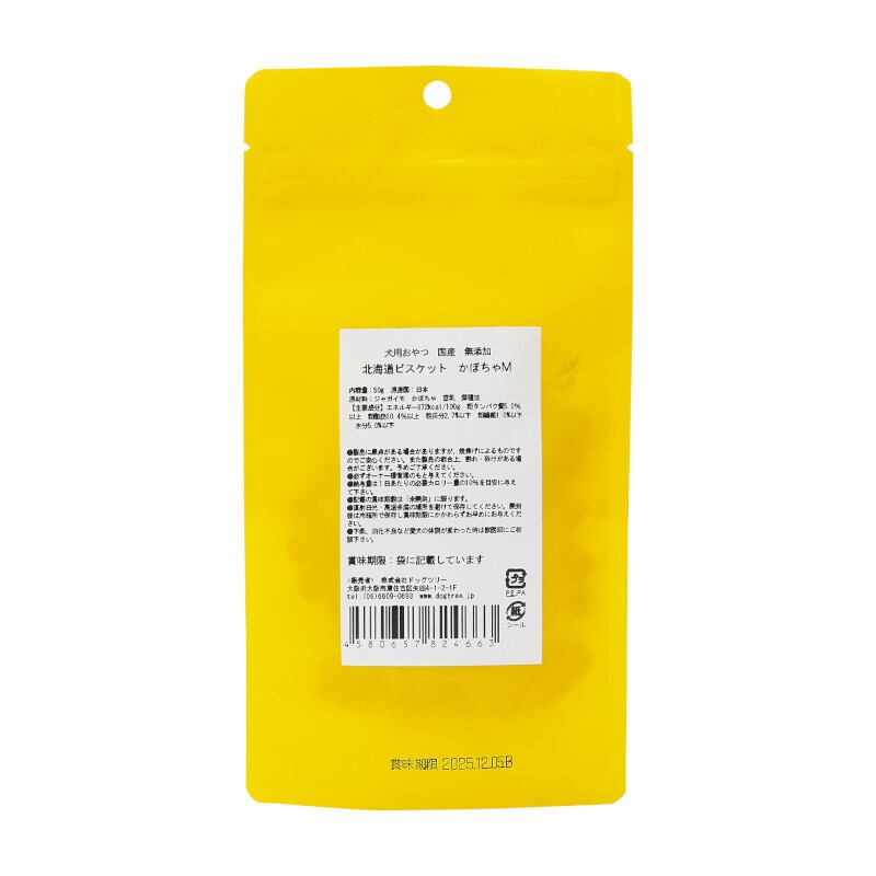 「【DOG TREE】北海道ビスケット かぼちゃS 50g」は、北海道産の甘くて栄養豊富なかぼちゃを使用した小型犬向けのヘルシーなおやつです!自然な甘みと香りを大切にしたビスケットが、愛犬に特別な瞬間を提供します。