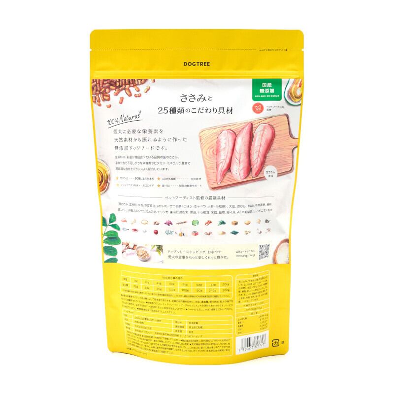 「【DOG TREE】ささみと25種類のこだわり具材 600g」は、愛犬の健康と幸せを考えた、栄養たっぷりのドッグフードです!選び抜かれた新鮮なささみを主成分に、25種類のこだわり具材を贅沢に使用しています。