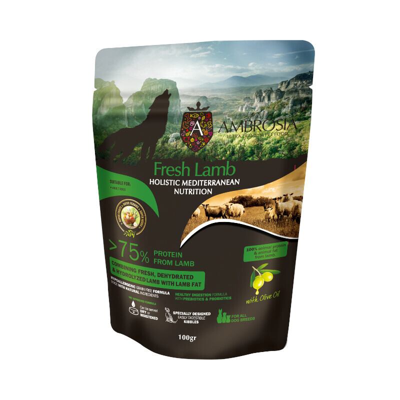 ホリスティック メディテラニアン ニュートリション ~ギリシャのパートナーの健康を気遣うヘルシーな地中海食~古代ギリシャから伝わる地中海食の原則に基づき、パートナーの健康長寿を目指したウルトラプレミアムフードです。アンブロシアは地中海食の特徴である「オリーブオイル」や「ハーブ」を上手に使うことで、不足しがちな栄養素を美味しく調理し、パートナーの健康維持に一番重要な「毎日の栄養バランス」を整えます。