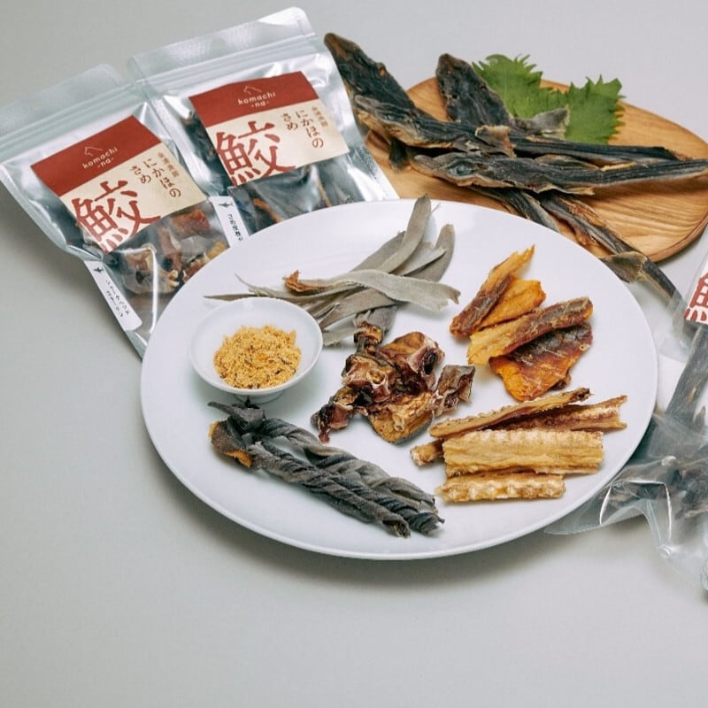 秋田県金浦で捕れた鮫を主成分とし、添加物は一切使用せずに製造されています。地元漁師の手によって丁寧に加工されているため、安心して日常的にお楽しみいただける商品です。家族や友人との時間をより豊かにしてくれます。