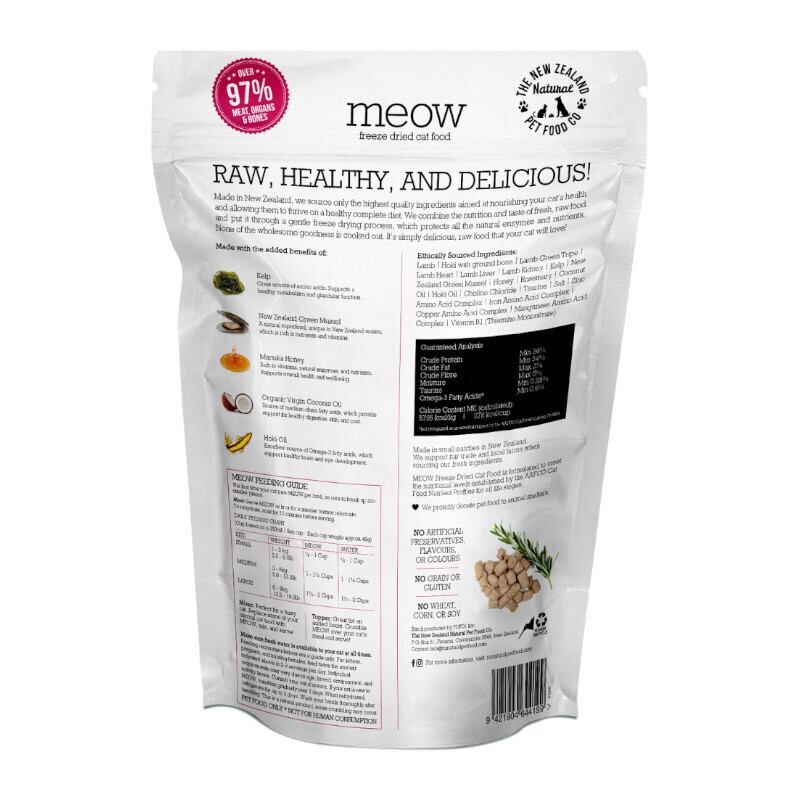 ラム、骨付きホキ、ラムグリーントライプ、ラムハート、ラムレバー、ラムキドニー、ケルプ、NZ緑イ貝、NZマヌカハニー、ローズマリー、オーガニックバージンココナッツオイル、ホキ油、タウリン、塩化コリン、亜鉛アミノ酸複合体、鉄アミノ酸複合体、銅アミノ酸複合体、ビタミンB1、マンガンアミノ酸複合体、塩