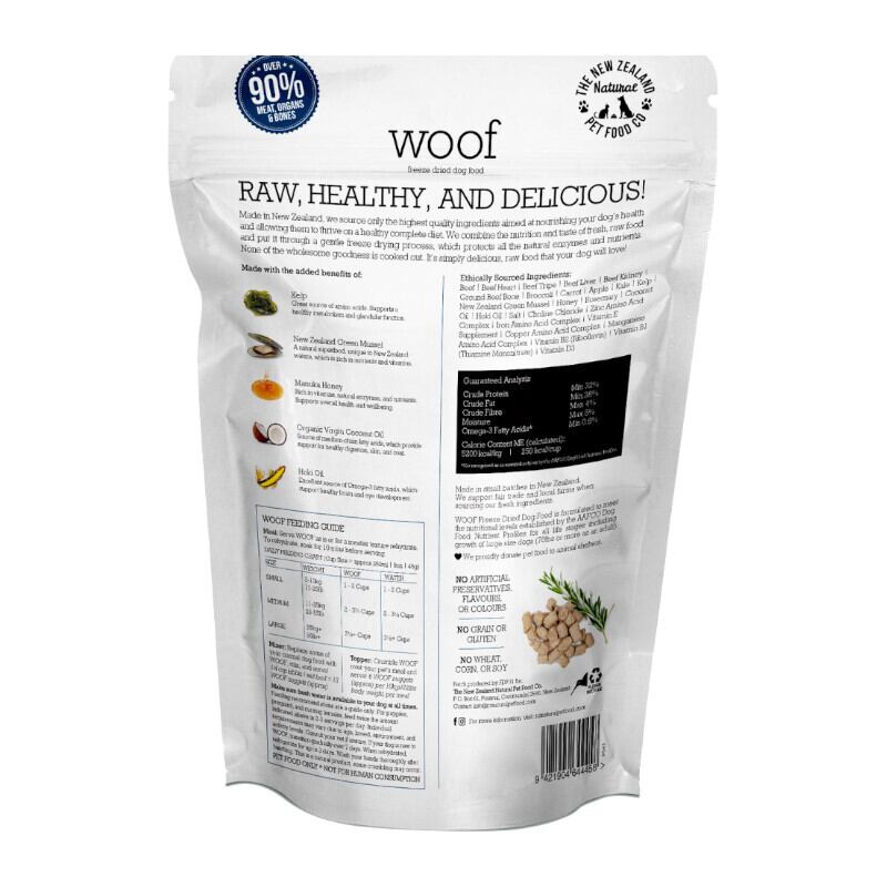 ビーフ、ビーフハート、ビーフトライプ、ビーフレバー、ビーフキドニー、牛骨、ブロッコリー、ニンジン、リンゴ、ケール、ケルプ、NZ緑イ貝、NZマヌカハニー、ローズマリー、オーガニックバージンココナッツオイル、ホキ肝油、ビタミンD3、塩、塩化コリン、亜鉛アミノ酸複合体、鉄アミノ酸複合体、ビタミンE、銅アミノ酸複合体、マンガンアミノ酸複合体、ビタミンB2、ビタミンB1