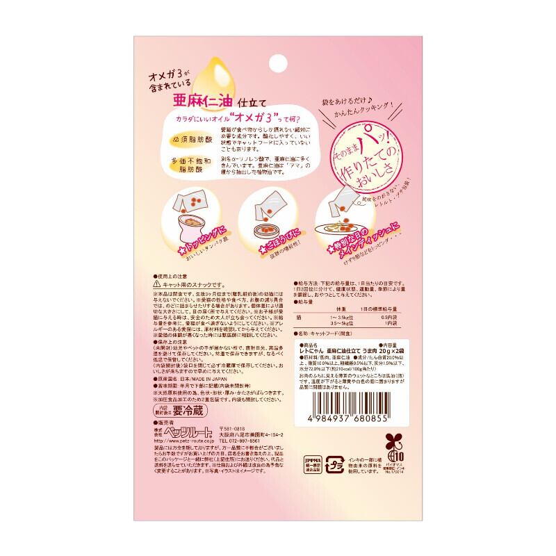 「【ペッツルート(Petz-Route)】レトにゃん 亜麻仁油仕立て うま肉 20g×2p」で、大切な愛猫に美味しさと健康をしっかりと届けましょう!