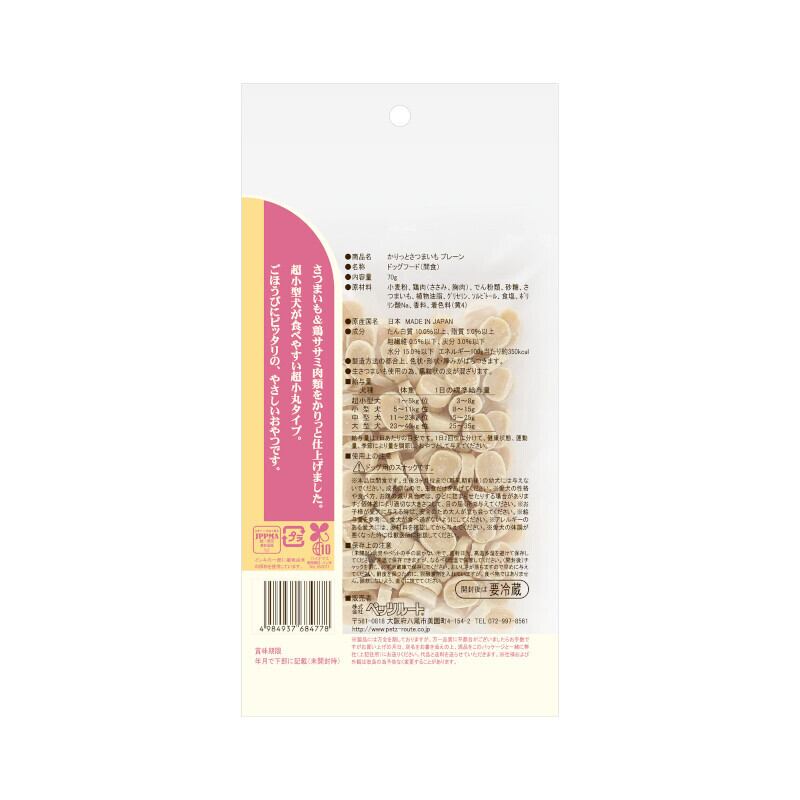 さつまいも&鶏ササミ肉類をかりっと仕上げました。超小型犬が食べやすい超小丸タイプ。ごほうびにピッタリの、やさしいおやつです。