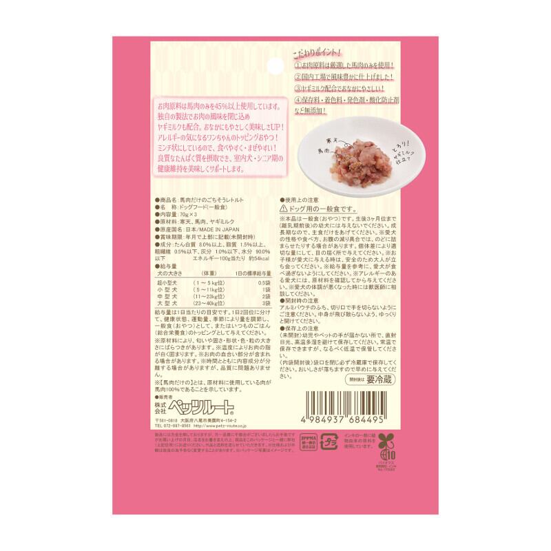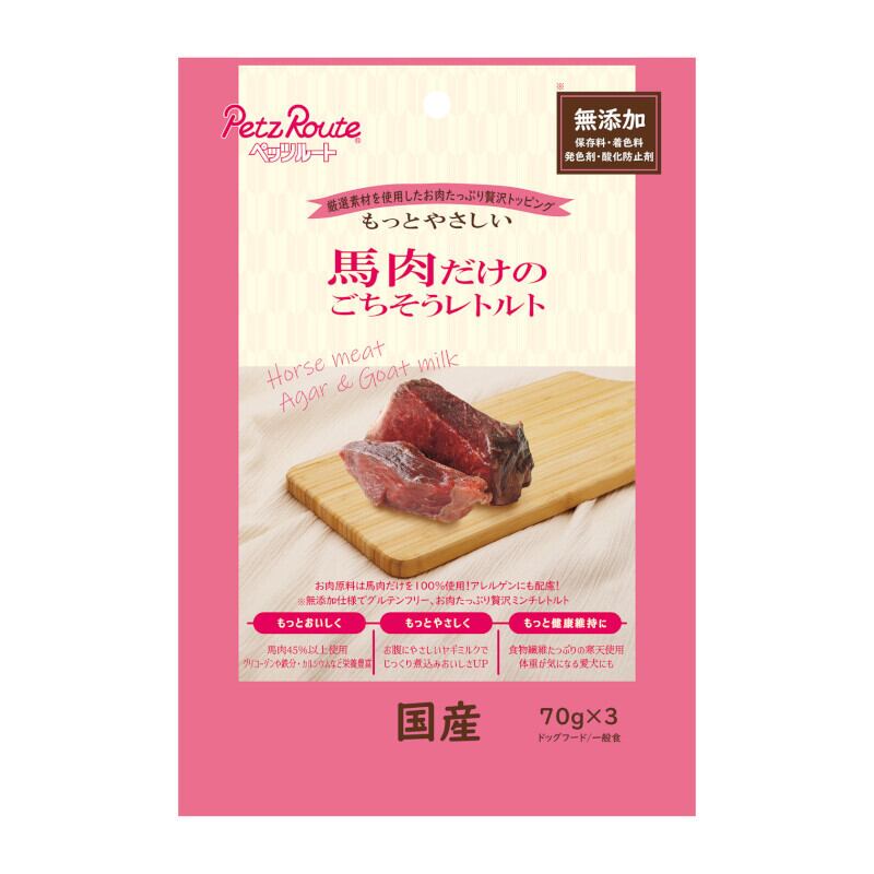 「【ペッツルート(Petz-Route)】馬肉だけのごちそうレトルト 70g×3p」で、大切な愛犬に美味しさと健康をしっかり届けましょう!