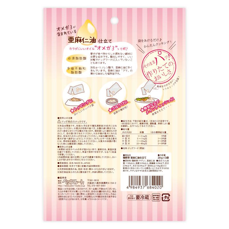 「【ペッツルート(Petz-Route)】鶏軟骨 亜麻仁油仕立て 20g×3p」で、大切な愛犬に美味しさと健康をしっかり届けましょう!