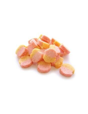小麦粉、鶏ささみ、ショートニング、さつま芋パウダー、苺パウダー、ソルビトール、プロピレングリコール、膨張剤、保存料(ソルビン酸K)、pH調整剤、食塩、着色料(赤106、黄4、黄5、酸化チタン)、香料、酸化防止剤(エリソルビン酸Na)たん白質 11.0%以上、脂質 3.5%以上、粗繊維 0.5%以下、灰分 3.0%以下、水分 38.0%以下エネルギー100gあたり:約260kcal