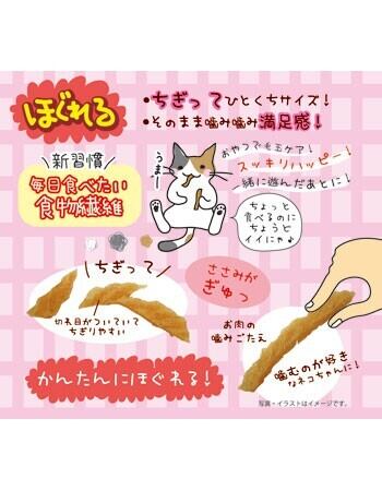 カンタンにほぐれます!噛むことが好きな猫に、お肉の噛みごたえを残した食物繊維入りの毛玉ケアスナックです。