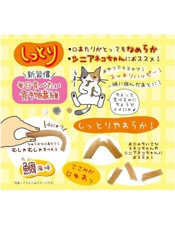 鯛風味で、口あたりがとってもなめらかなしっとりタイプです。シニアの猫におすすめしたい食物繊維入りの毛玉ケアスナックです。