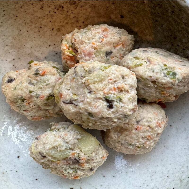 低カロリーで高たんぱく、そしてミネラル類やビタミンが豊富な砂肝を鶏のひき肉と混ぜボール状にしました。