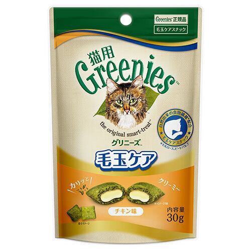 猫用グリニーズ毛玉ケア独自の食物繊維の配合で、飲み込んだ毛のスムーズな排泄をサポート。主原料は100%自然素材で、外はカリカリ中はとろけるクリームのチキン味。