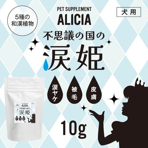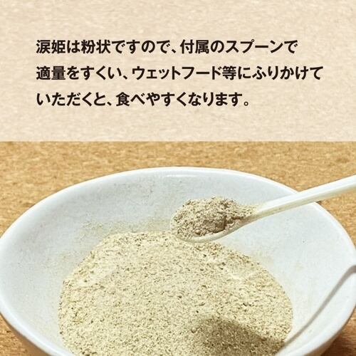 姫は5種の和漢植物をバランスよく配合した安心の健康補助食品です。涙姫は主に皮膚の健康状態をサポートいたします。涙姫は食べやすいように、ささみを配合しております。ふりかけ状(粉)ですので、むせたりする場合がございますので給与される場合は、他のフード(特に水気のあるウェットフードがおすすめです)と混ぜ合わせてください。