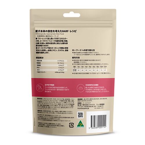 「草食動物を丸ごと食べていた野生のオオカミの食事が犬にとっても理想の食事である」愛犬本来の食性を考えたBARFレシピ(生物学的に適切なローフード)に基づき、開発されました。消化酵素やビタミン、ミネラル、必須脂肪酸(オメガ3脂肪酸/オメガ6脂肪酸)やプロバイオティクス(善玉菌)など、生肉や内臓にもともと含まれている栄養素が加熱加工処理によって失われないように加熱せずに加工を最小限に抑えたフリーズドライ製法を採用。オーストラリアの恵まれた自然の中で牧草を食べて育った放し飼いのポークとオーガニック野菜、フルーツなど安心安全な原材料を厳選し、良質な蛋白質と同時に消化に必要な酵素が生のままだからこそ得られます。ドライフードに比べて長期間の保存が可能で軽くて持ち運びが便利なため、非常時の保存食としてもご活用いただけます。