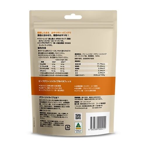 愛犬と愛猫の健康と美味しさを両立させた選択を!【フロンティアペッツ(frontier pets)】犬猫用ビーフグリーントライプ 50gは、オーストラリア産の新鮮なビーフグリーントライプを使用した、栄養満点なおやつです。この商品で、愛するペットとの特別なひとときをぜひ楽しんでください!