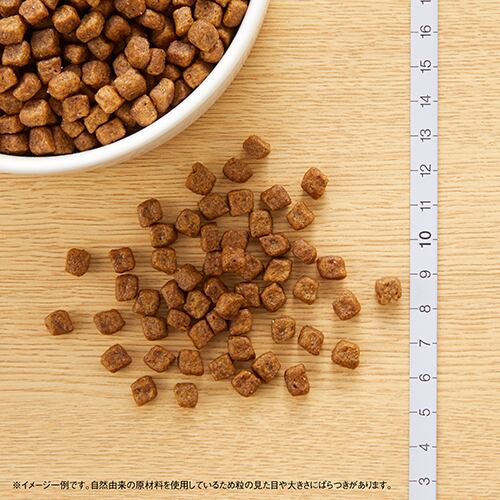 チキンの生肉を本来のおいしさをそのまま封じ込め、第一主原料に使用(ミートファースト製法)して、さらに、ふやけやすく、噛みやすい独自の粒デザイン(極小粒)にしています。
