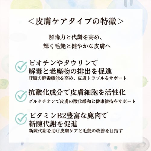 輝く毛艶と、健やかな皮膚のために。「食べるインナーケア」という発想のごはんです。デリケートな皮膚の健康維持に配慮し、体の内側からアプローチ。良質な鹿肉のタンパク質とビタミンB群が、皮膚の健康と美しい毛並みを保ちます。さらに、体の巡りに着目した食材をバランス良く配合。カサつきやベタつきが気になる愛犬の、本来の美しさを食事からサポートします。