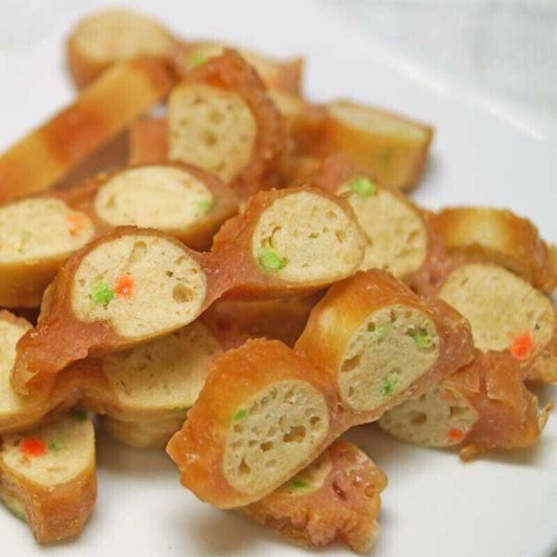 鶏肉(ササミ、胸肉)、小麦粉、でん粉類、野菜(にんじん、ほうれん草)、魚軟骨(コンドロイチン、グルコサミン含有)、ミネラル類(カルシウム、ナトリウム)、ソルビトール、グリセリン、プロピレングリコール、膨張剤、リン酸塩(Na)、酸化防止剤(ビタミンE)、発色剤(亜硝酸ナトリウム)、食用色素(赤102、赤106、黄4、青1)