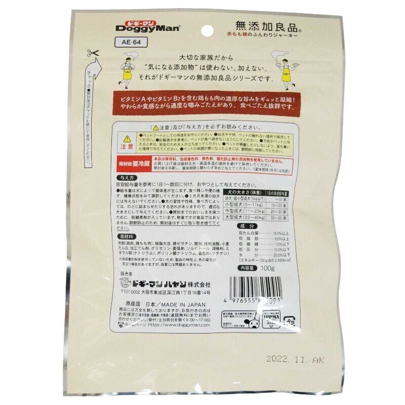 ・愛犬のために厳選された【ドギーマン(Doggy Man)】無添加良品 赤もも鶏のふんわりジャーキー 100g!国産の新鮮な赤もも鶏を贅沢に使用し、健康を考慮したおやつです♪