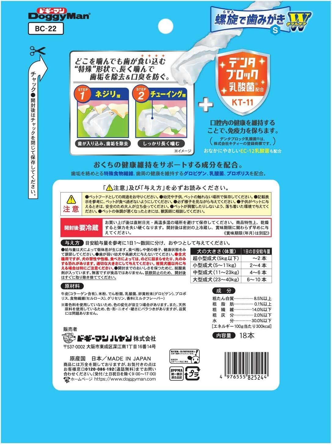 ●ワンちゃんの歯の構造、噛み方を熟知した獣医師と共同開発。歯が食込む螺旋形状と乳酸菌でお口をケアする歯磨きガム。●しっかり長く噛め、しっかり歯が食込み歯垢を除去する螺旋形状。口腔内の健康を維持する乳酸菌配合。●歯垢を絡めとる特殊食物繊維、歯周の健康を維持するグロビゲン、乳酸菌、プロポリス配合。●ほんのり甘いミルクの香り。小型犬向きSサイズ。●保存料、着色料、発色剤、酸化防止剤不使用の無添加良品。