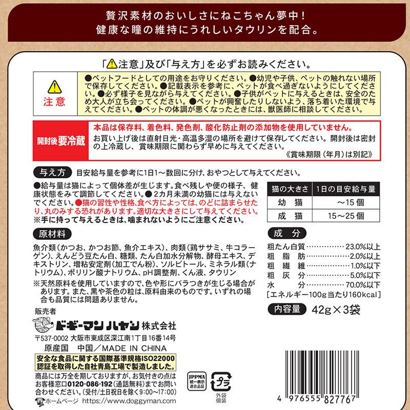 魚介類(かつお、かつお節、魚介エキス)、肉類(鶏ササミ、牛コラーゲン)、えんどう豆たん白、糖類、たん白加水分解物、酵母エキス、デキストリン、増粘安定剤(加工でん粉)、ソルビトール、ミネラル類(ナトリウム)、ポリリン酸ナトリウム、pH調整剤、くん液、タウリン