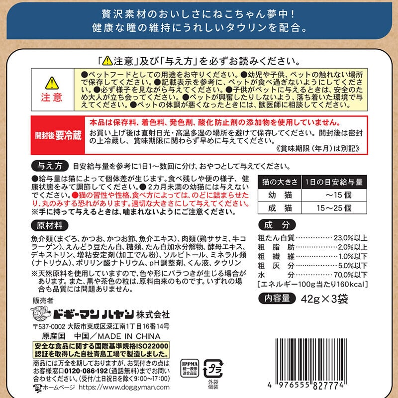 魚介類(まぐろ、かつお、かつお節、魚介エキス)、肉類(鶏ササミ、牛コラーゲン)、えんどう豆たん白、糖類、たん白加水分解物、酵母エキス、デキストリン、増粘安定剤(加工でん粉)、ソルビトール、ミネラル類(ナトリウム)、ポリリン酸ナトリウム、pH調整剤、くん液、タウリン