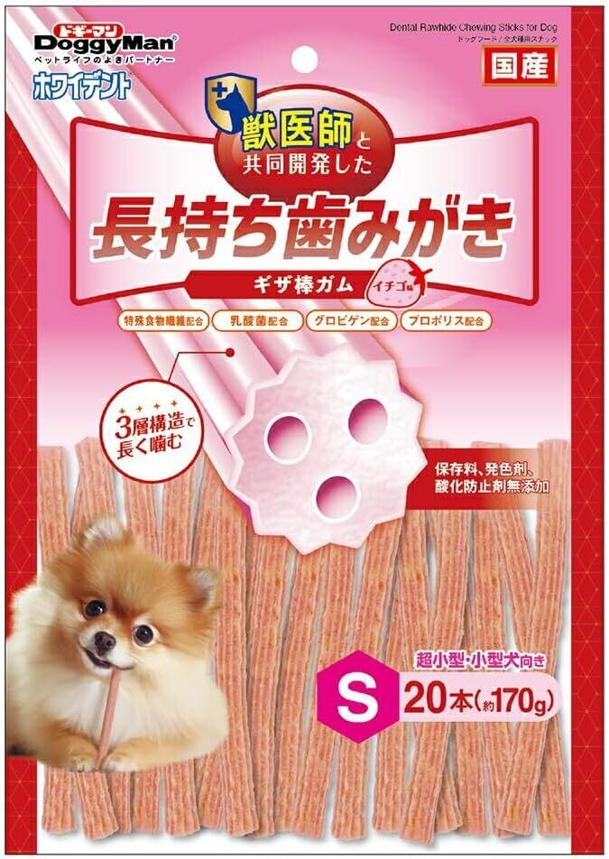 ### 商品説明文【ドギーマン(Doggy Man)】ホワイデント 長持ち歯みがき ギザ棒ガム イチゴ味 S 20本