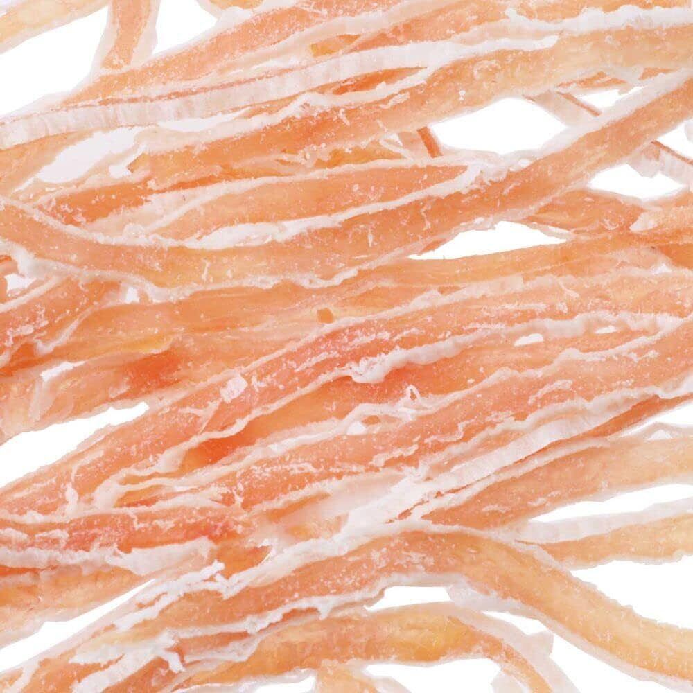 鶏ささみ生地を濃厚なおさかなのすり身でサンド。 鶏ささみを魚のすり身でサンドし、薄く、細くカットしたしなやかな麺状タイプのおやつ。固いものが苦手な子にも与えやすい。