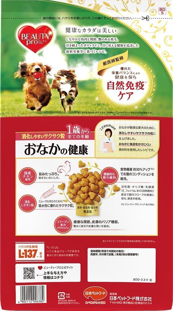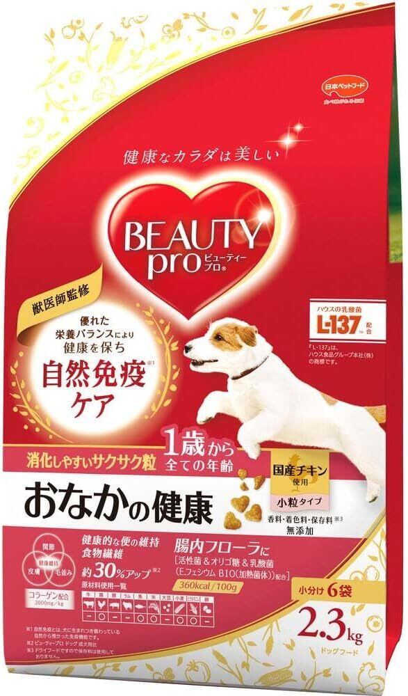 すべての犬種に自信を持ってお届けする【日本ペットフード】ビューティープロドッグ おなかの健康1歳から2.3kgです。愛犬との食事タイムが、より親密な関係を築く素晴らしいきっかけとなることでしょう!
