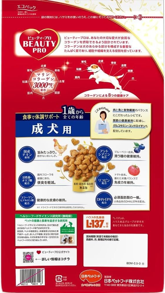 ### 商品説明文【日本ペットフード】ビューティープロ 成犬用1歳から 2.5kg
