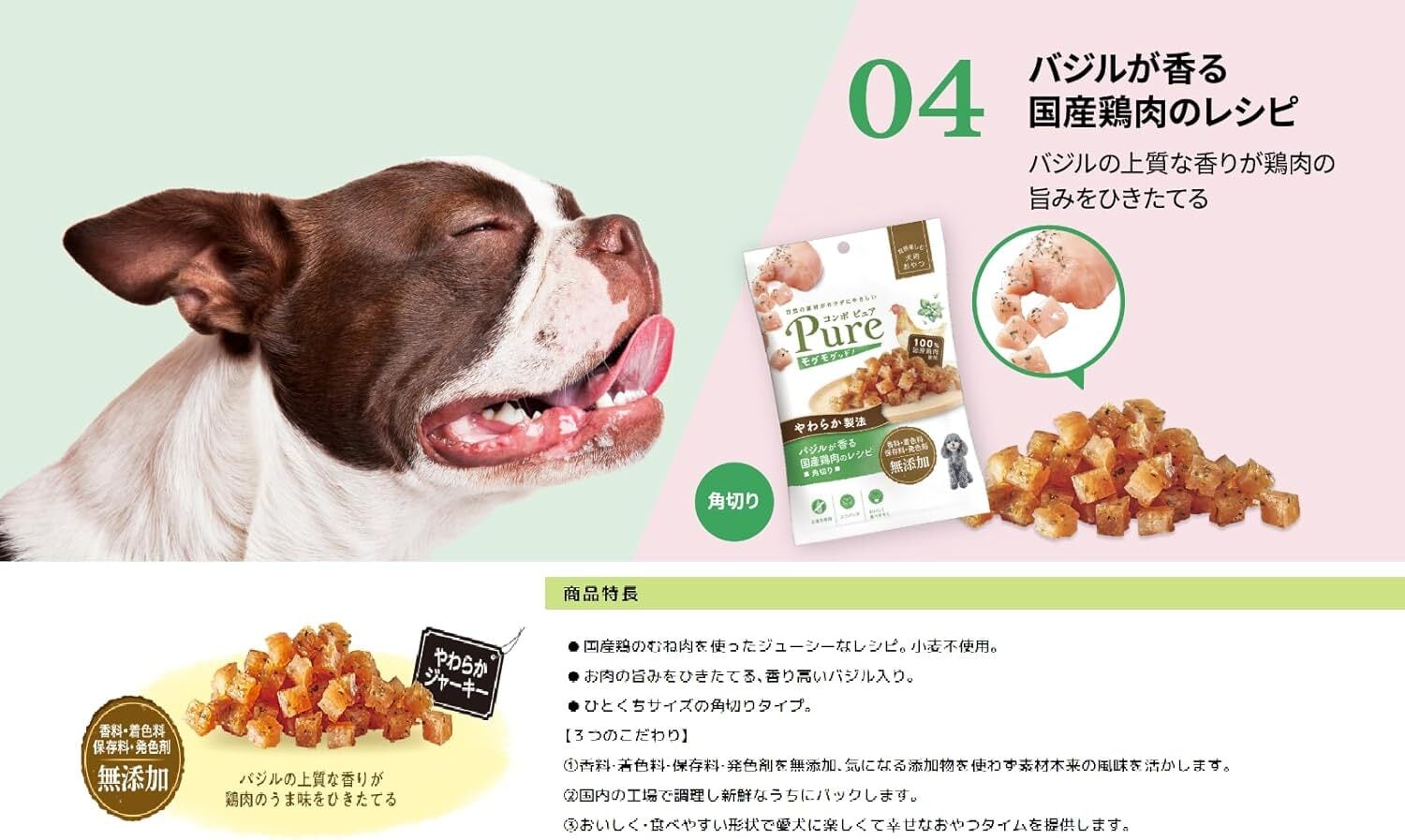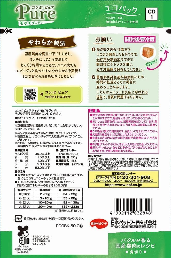すべての犬種に自信を持ってお届けする【日本ペットフード】コンボピュア モグモグッド!バジルが香る国産鶏肉のレシピ角切り 50g。おいしい食事を通じて、愛犬との関係をより密接に育む素晴らしい機会を提供します!