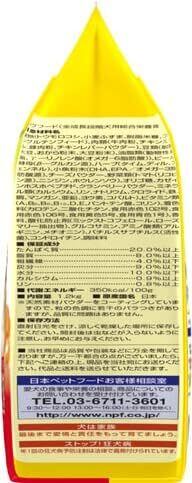 ■素材・成分:穀類(トウモロコシ、小麦ふすま、脱脂米糠、コーングルテンフィード)、肉類(牛肉粉、チキンミール、豚肉粉、チキンレバーパウダー)、豆類(脱脂大豆、おから粉末)、油脂類(動物性油脂、植物性油脂(オメガ?6脂肪酸含む))、ビール酵母(β?グルカン源)、ハーブ(タイム、ディル、フェンネル)、セレン酵母、小魚粉末(DHA、EPA/オメガ?3脂肪酸源)、チーズパウダー、野菜類(トマト(リコピン源)、ニンジン、ホウレンソウ)、オリゴ糖、カゼインホスホペプチド、クランベリーパウダー、ミネラル類(カルシウム、リン、ナトリウム、クロライド、鉄、銅、マンガン、亜鉛、ヨウ素、コバルト)、ビタミン類(A、B2、B6、B12、D、E、パントテン酸、コリン)、着色料(二酸化チタン、食用赤色102号、食用赤色106号、食用黄色5号、食用青色1号)、香料、酸化防止剤(ミックストコフェロール、ローズマリー抽出物)、グルコサミン、アミノ酸類(アルギニン、メチオニン)、バチルスサブチルス(活性菌)、コンドロイチン