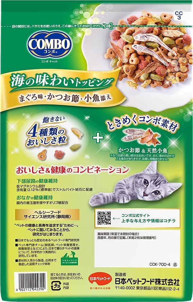 ■ 【日本ペットフード】コンボ まぐろ味・かつお節・小魚添え 700gは、愛猫の健康をしっかり支えるよう特別に設計されたフードです!