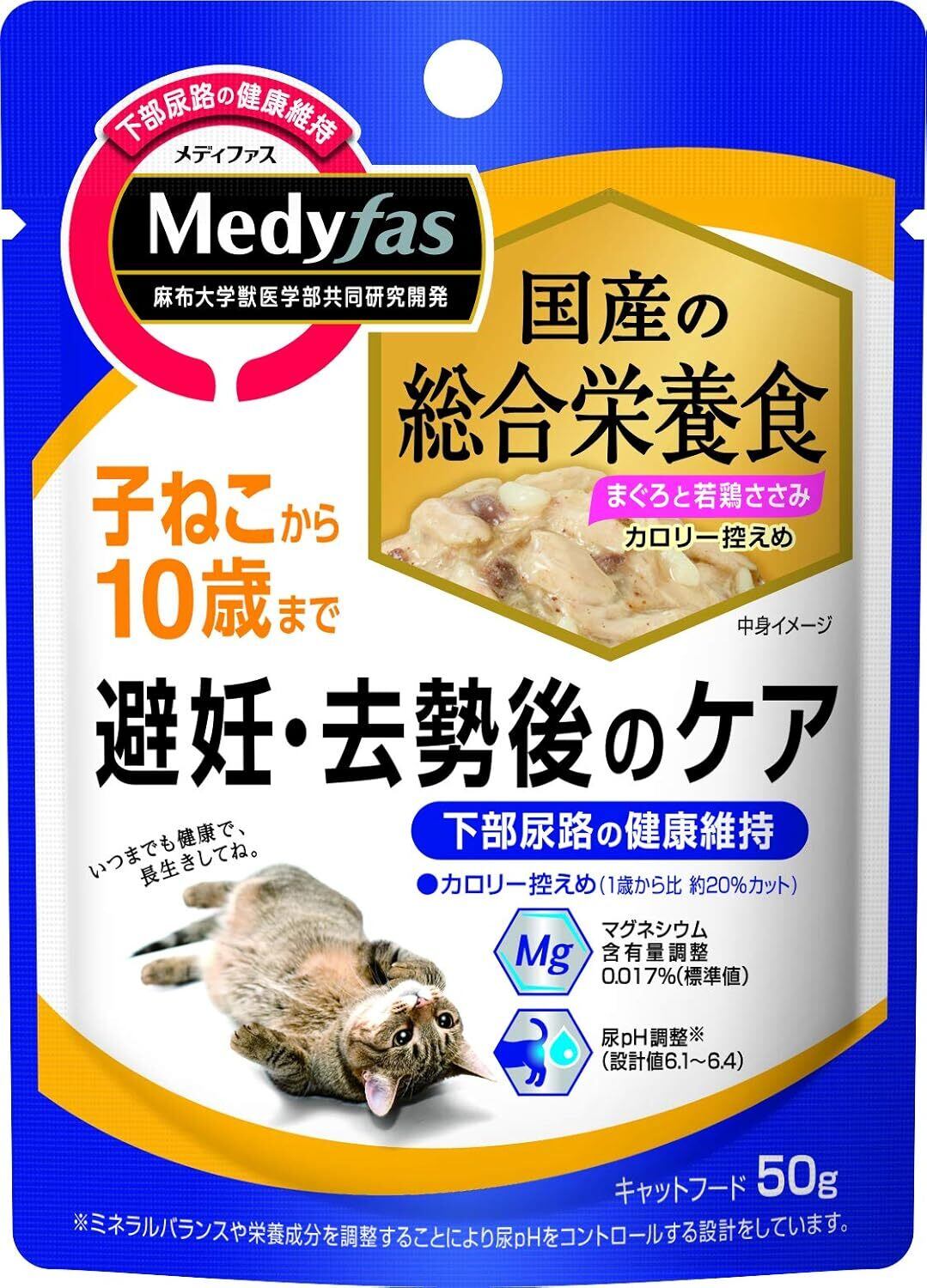 すべての猫種に自信を持ってお届けする【ペットライン(PETLINE)】メディファス ウェット 避妊・去勢後のケア子ねこから10歳まで まぐろと若鶏ささみ 50g。この商品で、愛猫との特別な時間を育んでください!