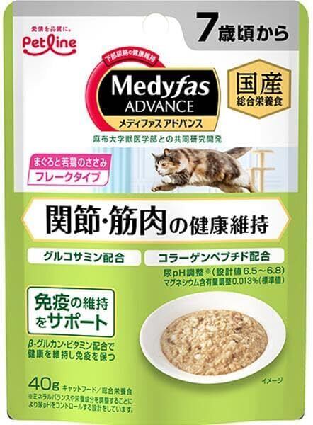 すべての猫種に自信を持ってお届けする【ペットライン(PETLINE)】メディファスアドバンス 関節・筋肉の健康維持7歳頃からまぐろと若鶏のささみ 40g。この商品で愛猫との特別な時間を育んでください!