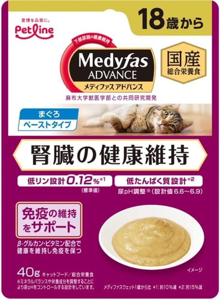 すべての猫種に自信を持ってお届けする【ペットライン(PETLINE)】メディファスアドバンス 腎臓の健康維持18歳からまぐろ 40g。この商品で愛猫との特別な時間を育んでください!